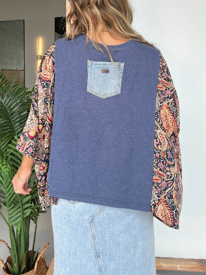 Design unic! Efect vintage pe fundal albastru + patchwork Paisley; grafica RAMONES pe spate cu contrast alb-albastru intens, rezistentă la spălare. Mâneci evazate cu pliuri discrete – ascund excesul de material, fără efect umflat. Guler relaxed care se adaptează la orice formă de față, lungime mid-hip care prelungește vizual picioarele. Cusături de precizie – fără aer ieftin!