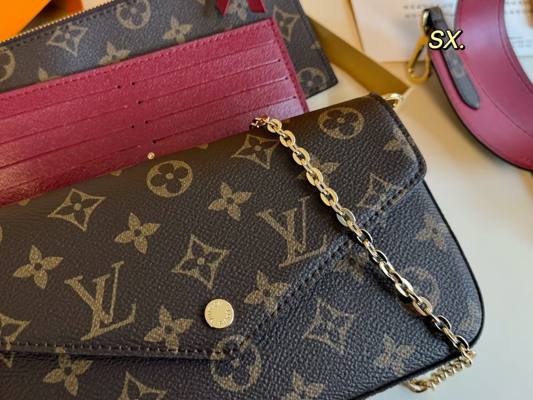 • Main Bag: Spacious enough for a phone, lipstick, and keys, with a secure flap closure.